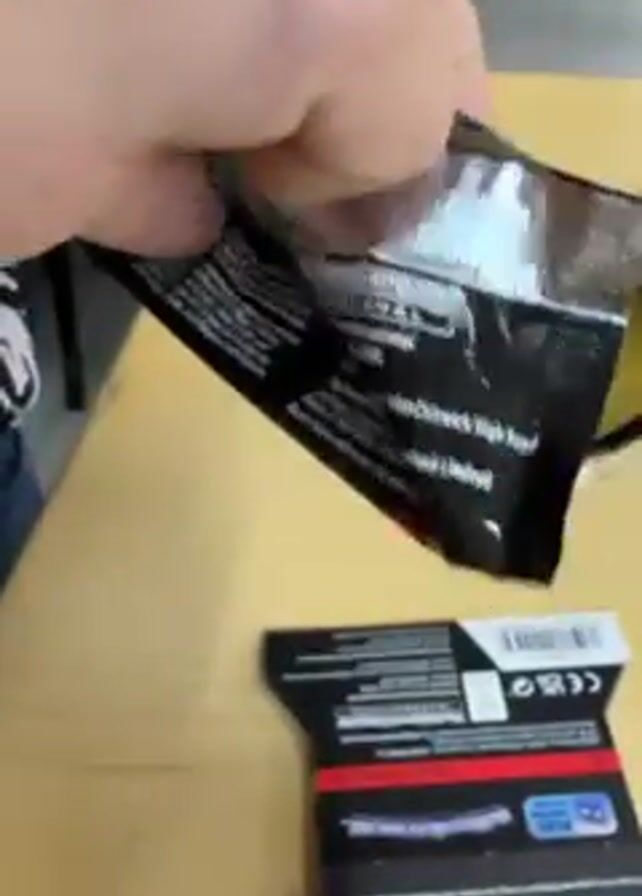 A person opens a Pokemon card pack on a tan table. Two hands with manicured fingernails are visible opening the pack, which is black and silver on the outside and yellow inside. Another, unopened pack lies below the one being opened. A small portion of another person and a blue chair are visible in the background. The video is recorded from above.