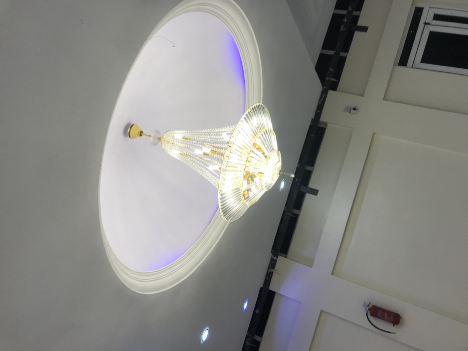 The image displays an interior scene, likely a hall or commercial establishment, located in Lekki, Nigeria. A large, multi-tiered chandelier, featuring gold-toned metal accents and numerous clear glass or crystal elements, is suspended from the white ceiling. The chandelier is illuminated, casting warm light. Surrounding its ceiling mount is a recessed, oval-shaped false ceiling feature with white decorative molding, within which a subtle purple light strip is visible along the edge. Several white recessed spotlights are distributed across the ceiling, some emitting a cool blue light. The walls are painted in a light, neutral color, exhibiting a structured design with recessed rectangular panels. A red fire extinguisher with a black hose is mounted on the wall in the lower-left quadrant. On a vertical wall segment or column towards the right, a small, white dome-shaped security camera is affixed. Below the main ceiling level and above the finished wall panels, exposed dark structural components are visible. In the lower-right corner, a section of a dark-framed window or door with reflective glass is partially visible. No individuals are present in the frame, and no actions or interactions are depicted.