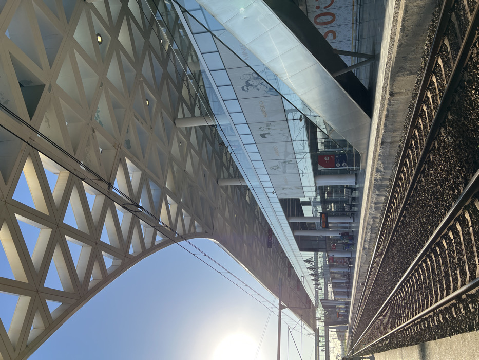 An angled perspective showcases modern architecture against a blue sky. A white, triangulated structure frames the view, contrasting with a sleek, glass-paneled building bearing faint advertising. To the right, parallel train tracks stretch into the distance. The sun's bright light is visible.