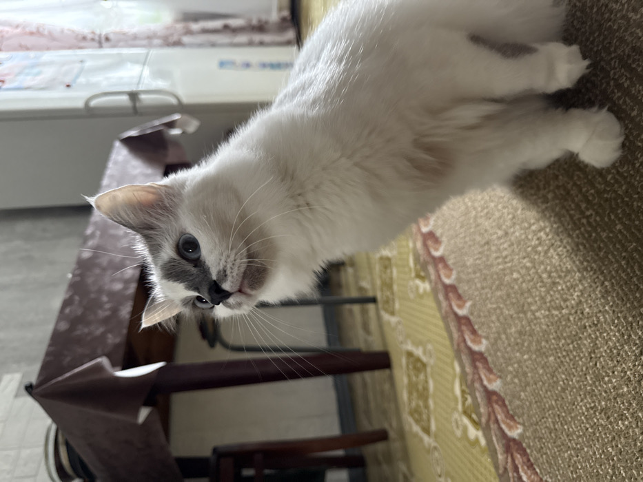 The image displays an interior residential scene featuring a domestic cat. The cat, exhibiting primarily white, medium-length fur with distinct light gray patches on its head, particularly around the ears and forehead, possesses blue eyes and a pink nose with prominent white whiskers. It is depicted in a seated position on a beige-brown rug with an ornate yellow and brown pattern, facing forward and slightly to the right, while its head is turned to the left, with its gaze directed upwards and to the left of the frame. In the background, out of focus, a dark wooden table covered with a dark brown or maroon tablecloth is visible on the left, with stacked plates partially discernible on its surface. Another dark wooden furniture leg is present further left. To the right, a white or light-colored appliance, possibly a refrigerator, with a vertical handle and subtle reflections, stands near a window draped with a sheer, light-colored curtain. The lighting suggests an indoor environment with an ambient light source originating from the right side of the frame. The scene is consistent with a typical indoor living space, but specific visual identifiers to confirm the location as Chaikovsky, Russia, are not present within the image itself.