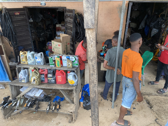 This image depicts the exterior of an auto parts and repair shop in Lokoja, Nigeria