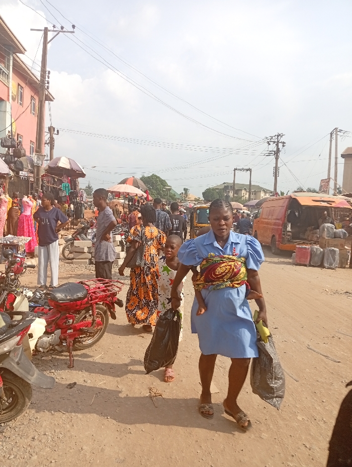 The image depicts a bustling market street in Nnewi, Nigeria, under an overcast sky