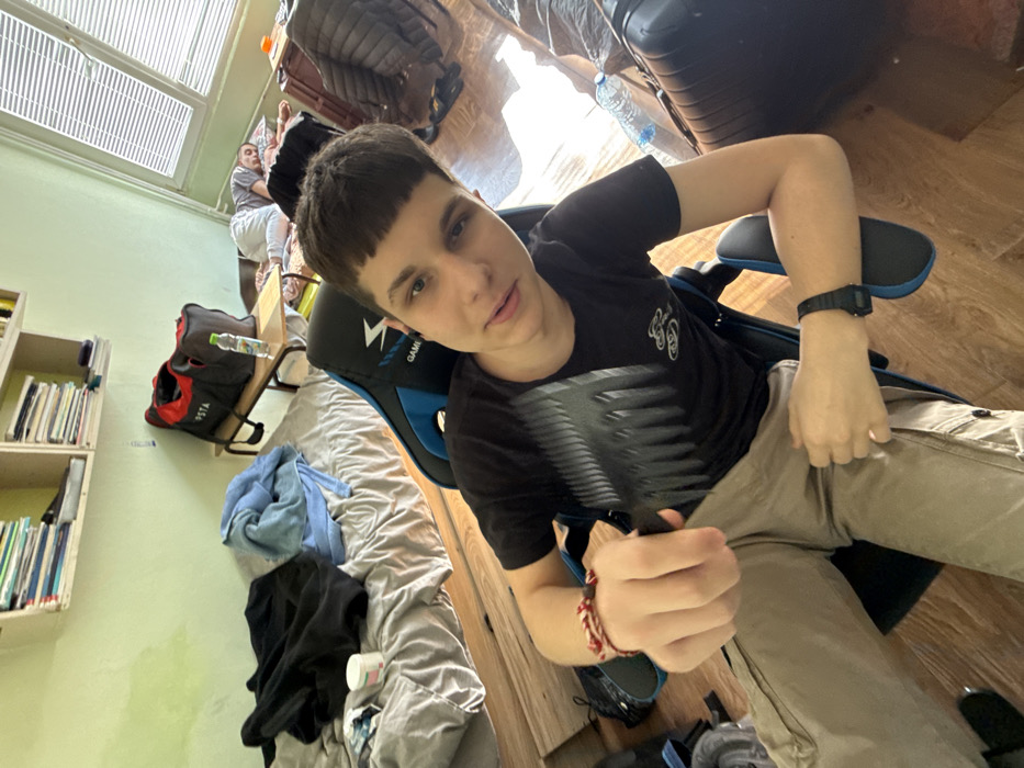 The image depicts a dormitory room located in Pravets, Bulgaria. The room features light green walls and a wooden floor, illuminated by natural light entering through a window with white venetian blinds on the right wall. In the foreground, a young male, appearing 18-25 years old, is seated in a black and blue gaming chair, facing the camera. He has short, dark hair and is wearing a black t-shirt with a white graphic and light brown cargo pants. His right hand holds a black wide-tooth comb pointed towards the camera. A red and white braided bracelet is on his left wrist, and a black digital watch is on his right wrist. He maintains a neutral expression. The room contains at least two single beds with grey bedding. On the bed to the left of the foreground subject, dark clothing and a light blue towel are disheveled, alongside a small white container with a pink lid. A second individual is partially visible lying on their side on this bed. A small wooden bedside table is positioned between this bed and the next, holding a red and black duffel bag with "PSTA" text and a plastic water bottle. A third individual is lying on their back on the bed near the window, appearing to be asleep or resting under a light-colored sheet, wearing a light-colored t-shirt. A wall-mounted light wooden shelf unit filled with books is visible above the left bed. In the far right background, a black suitcase stands next to another bed or mattress, which has a dark jacket folded on it. A black backpack is on the floor next to the left bed.