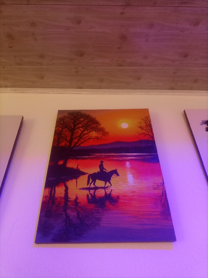 painting of a lone cowboy riding a horse through a shallow body of water at sunset. The scene is rendered in shades of orange, red, and purple, with a tree silhouette on the left. Reflections of the trees and rider are visible in the water. The painting is displayed between two other pieces, all mounted on a white wall beneath a paneled ceiling.