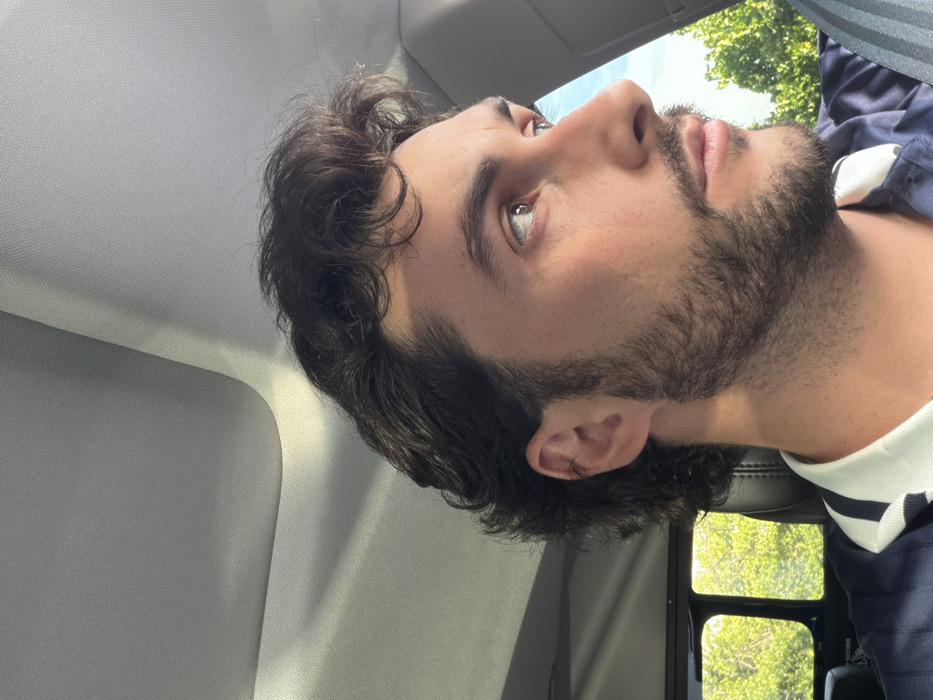 A close-up, angled shot of a man's face in profile inside a vehicle. He has dark, curly hair and a beard. He is looking upwards. A gray headliner is above him and a partial window view of green trees can be seen in the background. He's wearing a dark shirt with a white collar.