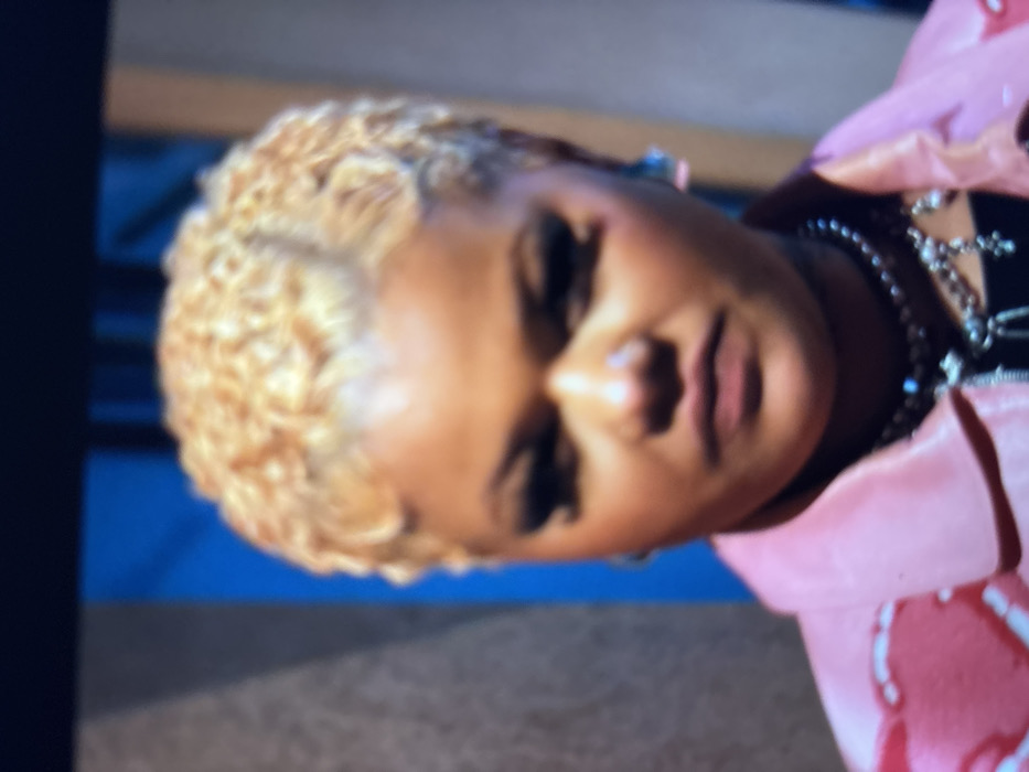 The scene is a close-up portrait of an adult female in Maisons-Alfort, France. She has a medium-dark complexion and short, light blonde, coiffed wavy hair. Her eyes feature prominent dark eyeliner and long false eyelashes. A small stud nose piercing is visible on her left nostril. She is wearing a shiny light pink jacket, potentially leather, with a distinct outlined or raised pattern on the left chest area, over a black top. Multiple silver-toned necklaces adorn her neck, including a pearl or beaded choker and longer chains with various pendants, one of which appears to be a small cross. A translucent, light-colored geometric earring hangs from her right ear. The blurred background consists of a vertical light grey textured panel on the left and a vertical bright blue section on the right, indicating an indoor, likely studio, environment.