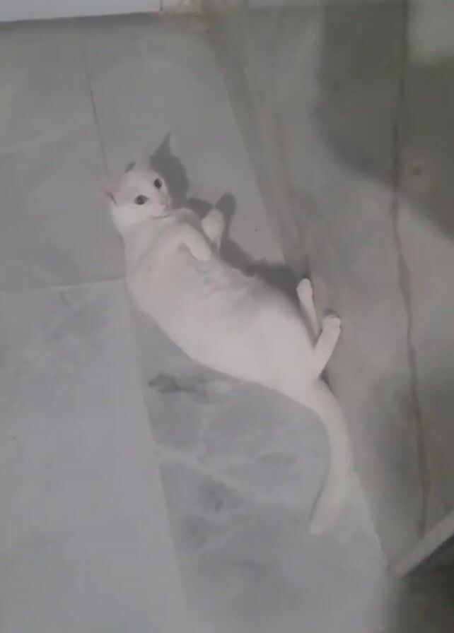 white cat lying on its back on a gray tiled floor. The cat meows and then curls up to lick its body. The camera is stationary and the lighting is dim. There are parts of two walls visible at the top and right edges of the frame.
