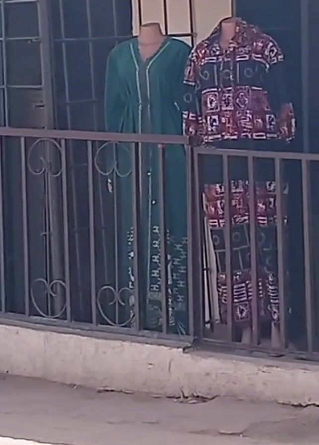 storefront with a barred window, displaying three outfits on mannequins. On the left is a long green dress with white embroidery near the bottom. In the center is a two-piece outfit with a red and black geometric pattern. On the right is a dark green robe with white geometric shapes. There is a stone on the ground in front of the window. The camera pans from left to right. There is speech in the background.