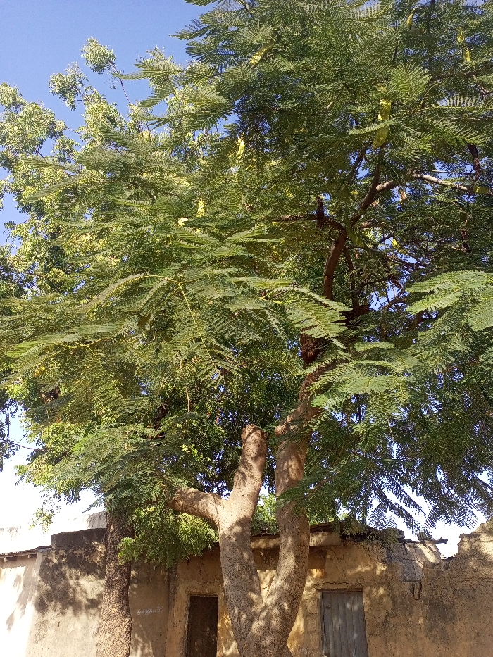 A large tree with compound leaves dominates the frame against a bright blue sky. Some seed pods hang from branches. Below, a weathered building with a small door and a shuttered window stands in its shade. The building's earthen walls show signs of age and wear. The tree’s trunk is thick and splits into multiple stems near the base, nestled against the building. The image captures a scene of natural growth intertwined with human construction.