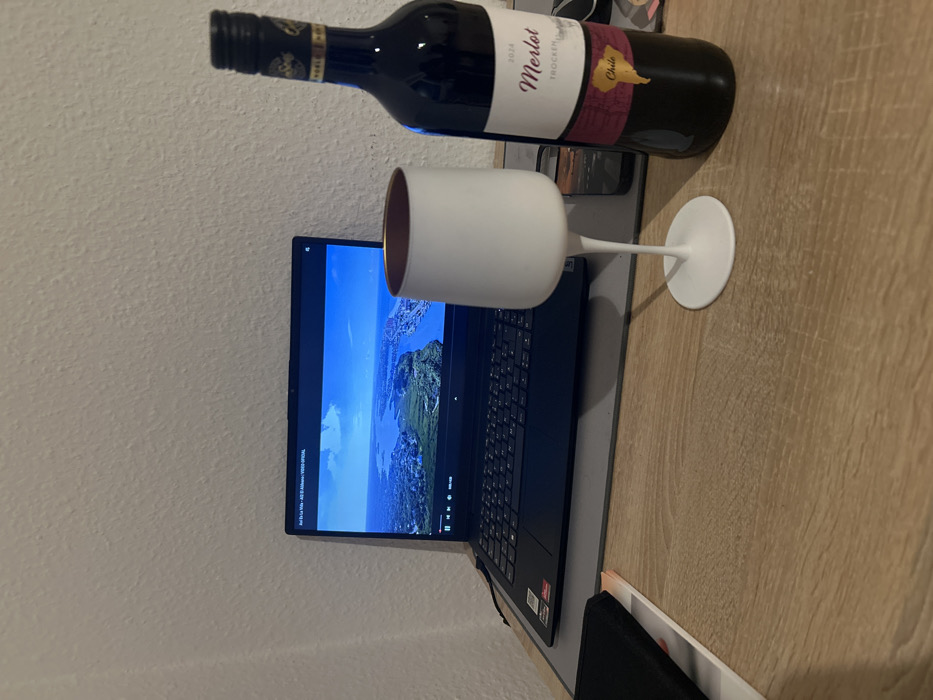 The scene, located in a room within Dresden, Germany, displays a desk arrangement. A dark-colored laptop, open on a light grey desk mat, exhibits a video on its screen titled "Del La Vida - AD El Aldeano - VIDEO OFICIAL." The video content is an aerial view of a coastal or riverine landscape with structures under a clear blue sky. To the right of the laptop, a white, opaque wine glass with a metallic copper-toned rim stands empty. Adjacent to the wine glass on the right is a dark glass bottle of red wine, clearly labeled "Merlot," "2024," "TROCKEN," and originating from "Chile," appearing mostly full. All items are placed on a light brown wooden desk surface. A textured, off-white wall forms the background. A black-covered notebook or similar item is positioned on the desk to the far left. A small, dark object, possibly a smartphone, is partially visible behind the wine glass. No individuals are depicted in the image.