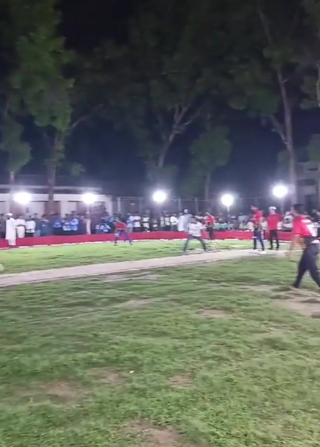 A cricket game is taking place at night on a grassy field surrounded by trees. Floodlights illuminate the playing area, where several players are actively involved in the game. In the background, a crowd of spectators watches from behind a red barrier. The players are wearing athletic attire. The camera angle captures the action from a medium distance.