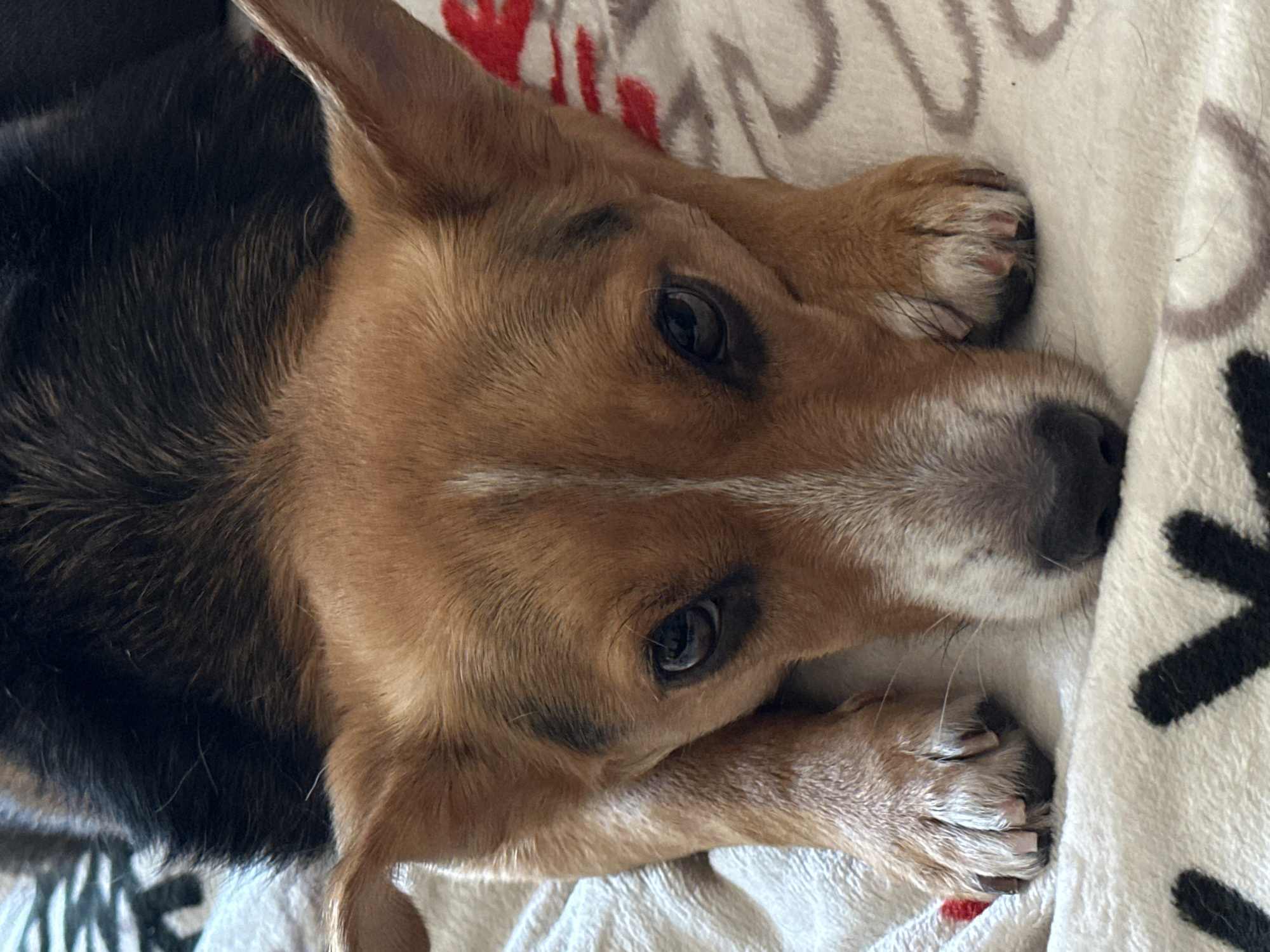 A domestic dog is depicted in a close-up, head-on view, resting indoors. The animal has a predominantly reddish-brown coat on its head and face, transitioning to black fur on its visible back and upper torso. A prominent white stripe extends down the center of its forehead and muzzle, which also features white fur around the snout and chin. Dark, almond-shaped eyes are directed forward, with darker brown or black markings surrounding them and a dark, possibly black, nose. Its forepaws are visible, resting side-by-side on a surface. The dog is lying on a soft, light-colored, possibly cream or off-white, textured blanket. The blanket exhibits a repeating pattern of dark, abstract shapes (likely black or dark gray) and scattered red design elements. The scene is located in Odesa, Ukraine.