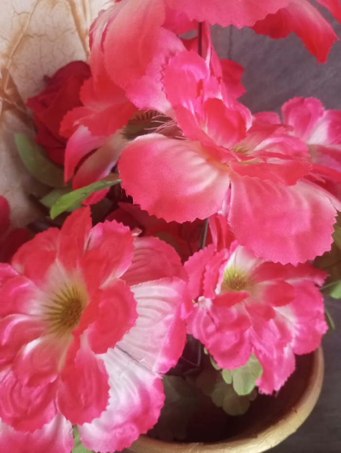 The scene captures a close-up, static display of artificial flowers located in Gwarinpa, Nigeria. The primary subjects are multiple faux flowers, predominantly fuchsia pink with white undersides or inner petal portions, exhibiting a two-tone appearance. Many petals feature a serrated or slightly wavy edge texture, indicative of fabric construction. Central to some flowers are faint yellow-green stamen-like structures. Interspersed among the pink flowers are artificial green leaves and partially visible, deeper red faux flowers, possibly roses, in the upper left quadrant. The floral arrangement is contained within a round, light brown or terracotta-colored pot, visible in the lower right and bottom edges of the frame, showing a subtle golden rim. The background is indistinct, comprising a mottled dark grey-brown area behind the flowers and a lighter, textured beige or brown surface in the upper left. The environment appears to be an interior setting under soft, diffused lighting. No people are present, and no actions or interactions are depicted.