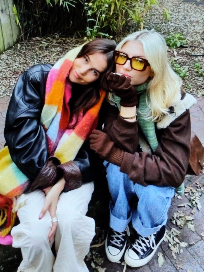 Two young adult females are seated outdoors on a reddish-brown brick-paved surface, partially covered with dried leaves. In the background, green foliage, possibly bamboo, and a wooden fence are visible. The individual on the left has dark brown hair and is wearing a black leather jacket over a black top, with light-colored (possibly cream or white) trousers. A voluminous, multi-colored striped scarf in shades of pink, orange, yellow, blue, and green is draped around her neck and shoulders. Her left hand rests on her thigh, displaying a ring on her left ring finger and manicured nails. She is leaning slightly towards the right individual and looking at the camera with a subtle smile. The individual on the right has blonde hair and is wearing dark brown, oversized square-frame glasses with yellow-tinted lenses. She wears a brown jacket featuring a light-colored shearling collar and a visible shearling lining. A light green knit scarf is wrapped around her neck. She is wearing brown fingerless gloves and has her hands brought together near her mouth, performing a gesture that resembles blowing a kiss. She is dressed in light blue, cuffed jeans and black high-top canvas sneakers with white laces and toe caps. She is looking directly at the camera with a neutral expression. The precise location within the city of Oslo, Norway, is not discernible from the visual information presented in the image.