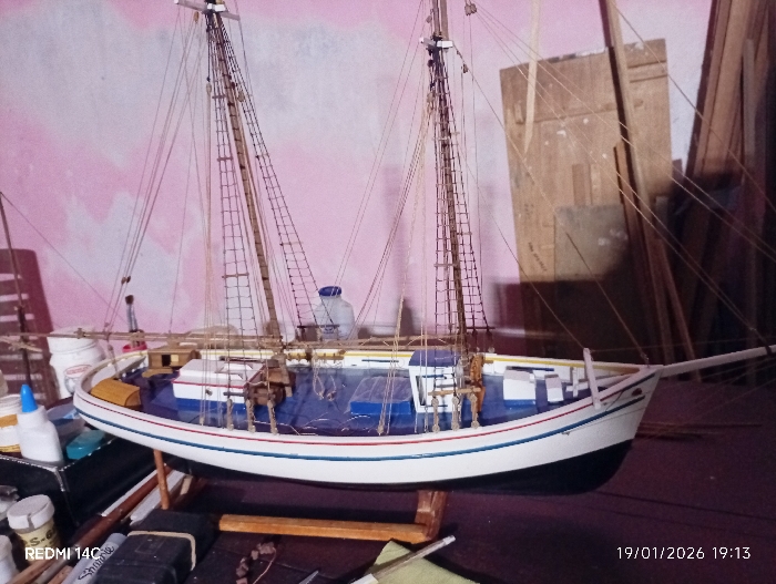 A detailed model ship rests on a wooden stand. Its hull is painted with a black lower section, a white stripe, and thin red and blue accent lines above. The deck is blue with white details. Two tall masts are rigged with intricate thread and rope. In the background, wooden planks and tools suggest a workshop setting. Paint bottles and supplies are visible in the lower left corner. A date stamp appears in the lower right corner.