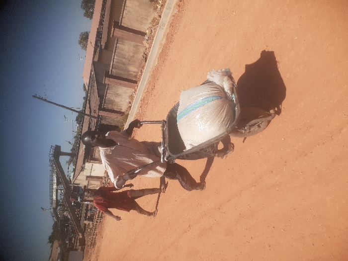 The image depicts two males on a reddish-brown unpaved road in Jos, Nigeria, under a clear blue sky. In the foreground, a dark-skinned male wearing a light-colored striped button-up shirt and dark trousers pushes a single-wheeled wheelbarrow loaded with a large, bulging white sack featuring blue and green stripes. He is looking towards the camera, exhibiting an open-mouthed expression with upturned corners. Behind him and to his left, a second dark-skinned male, dressed in a red short-sleeved shirt and light trousers, walks on the same road, also looking towards the camera. Both individuals cast strong, dark shadows to their right. The background features a prominent concrete overhead pedestrian bridge (flyover) with multiple ramps and stairs, a structure characteristic of the Terminus area of Jos. To the right of the road, a low concrete curb borders a series of sand-colored perimeter walls and single-story buildings. A utility pole with power lines is visible in the middle-ground on the right side of the frame. The overall environment appears dry and dusty under bright sunlight.