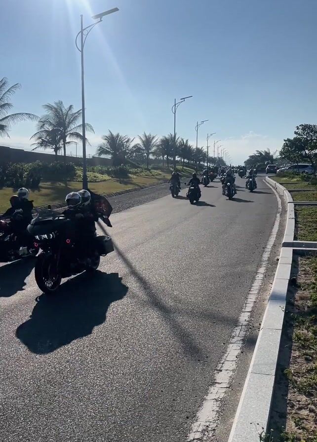large group of motorcycles driving down a two-lane road under a bright, sunny sky. The road is flanked by a grassy area dotted with palm trees and street lights. The motorcycles are mostly dark-colored and appear to be part of an organized ride, with riders wearing helmets and protective gear. The camera is positioned near the side of the road, capturing the procession as the motorcycles pass by. The general impression is a scenic, organized motorcycle ride on a clear day.