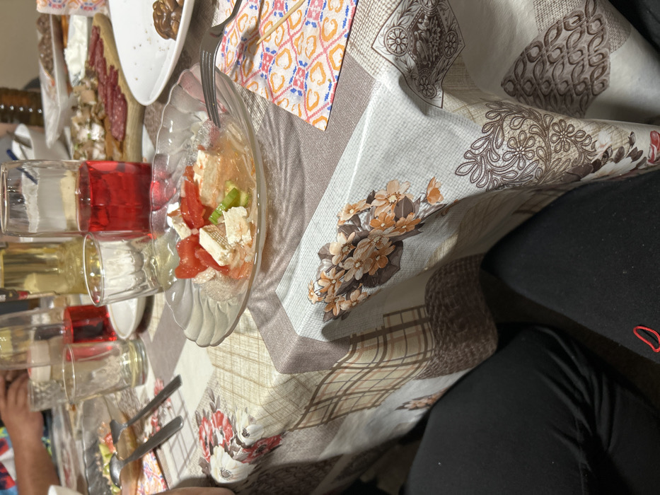 An indoor scene in Trakiya, Bulgaria, depicts a dining table viewed from a low perspective. The table is covered with a patterned tablecloth featuring a patchwork design of floral motifs and geometric grids. In the foreground, a clear, scalloped glass bowl contains a partially consumed salad composed of diced tomatoes, white cheese, and cucumber in liquid, with a silver fork resting within it. To the right, a white plate shows food remnants. Further back, a wooden board holds sliced cured meats and other appetizers. Multiple clear glasses, two containing a red liquid, and two bottles with a yellowish liquid are visible on the table. Cutlery is scattered across the tablecloth and in dishes. The hands of at least one person are visible in the upper left, while the lower legs of another person, clad in black pants, are visible under the table in the foreground.