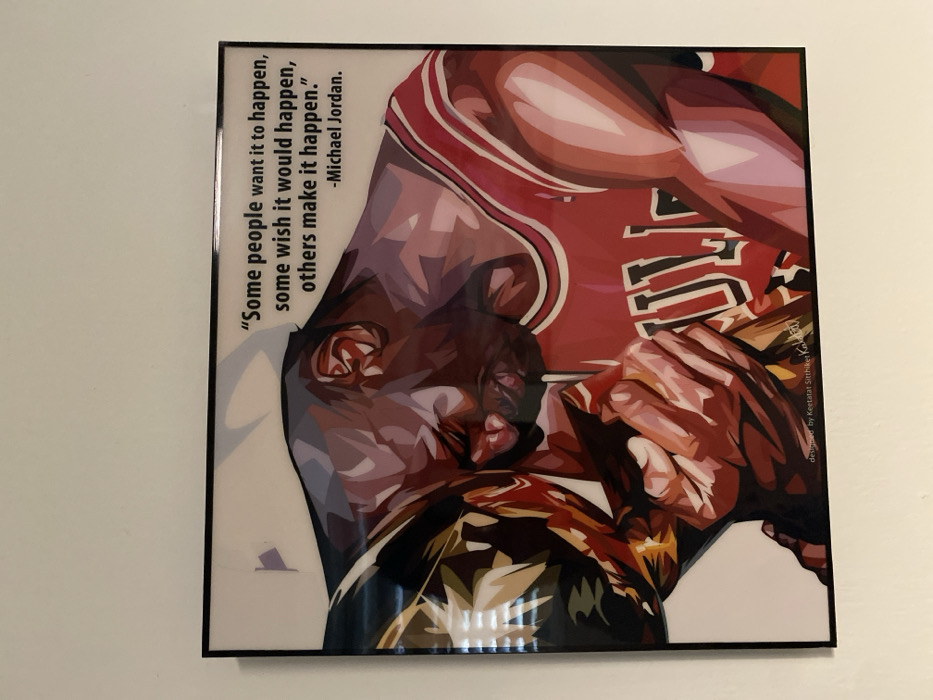 A framed poster is centrally mounted on a plain, light-colored wall in a location specified as Rishon LeZion, Israel. The poster features a stylized, pop-art illustration of Michael Jordan, depicted from the chest up. Jordan is shown with his head slightly bowed and turned to the right, wearing a red Chicago Bulls jersey with white trim, where the word "BULLS" is partially visible. His right hand is prominently displayed, appearing to grip an abstract, golden-hued object. In the upper right corner of the poster, a quote in black text reads: ""Some people want it to happen, some wish it would happen, others make it happen." -Michael Jordan." At the bottom center, white text attributes the design to "Keetatat Sitthiket K.Sitthiket." The poster is enclosed in a slim black frame. Reflections on the glossy surface of the poster indicate ambient lighting conditions, with a distinct reflection of horizontal blinds visible on the left side.