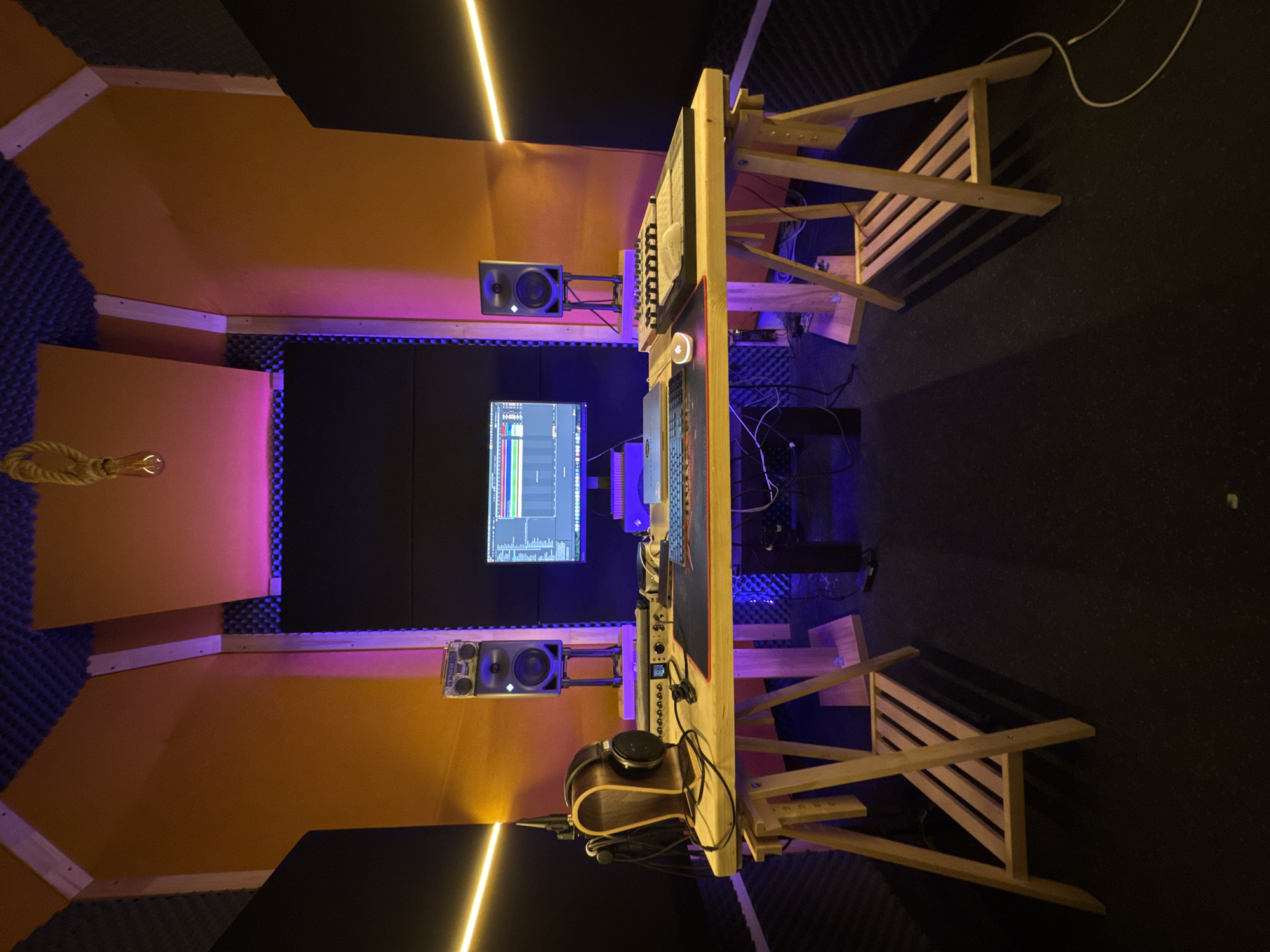 interior of what appears to be a sound recording or music production booth. The booth is constructed with orange and black soundproofing panels. Light strips provide illumination from above. Centrally located is a computer monitor displaying a digital audio workstation (DAW) interface. Studio monitors are mounted on either side of the monitor. A wooden desk supports audio equipment including a mixer, keyboard, and headphones. Two wooden chairs flank the desk. The scene suggests an environment for audio creation, with elements focused on sound treatment and recording equipment. The location in Plovdiv, Bulgaria is not ascertainable from the image alone.