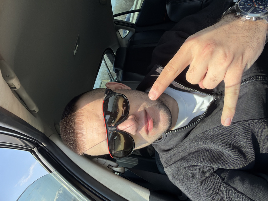The scene is set in German, Bulgaria. A male individual is depicted from the chest up inside a vehicle, positioned in what appears to be the driver's seat. He has short, dark, buzzed hair and a light stubble beard. He wears dark aviator-style sunglasses with red trim along the top frame, a black zippered jacket over a white t-shirt, and a silver-toned wristwatch with a dark blue dial on his left wrist. His right hand is raised to chest height, performing a "rock and roll" hand gesture with extended index and pinky fingers, while the thumb is also extended. The vehicle's interior features dark upholstery for the seats and a light gray headliner. Strong sunlight illuminates the scene from the left, creating visible reflections on the sunglasses. Through the partially open driver's side window, a clear blue sky and distant, indistinct green and brown vegetation are visible under bright daylight conditions.