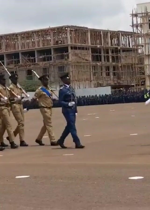 In a wide shot, a column of men in tan uniforms march in formation on a large, brown surface, likely a parade ground. They are holding rifles with bayonets affixed, and their movements are synchronized. Alongside this group, four men in blue uniforms march. A large group of people is visible in the background. In the background, there are two buildings; one appears to be under construction, while the other looks complete. The sky is overcast.
