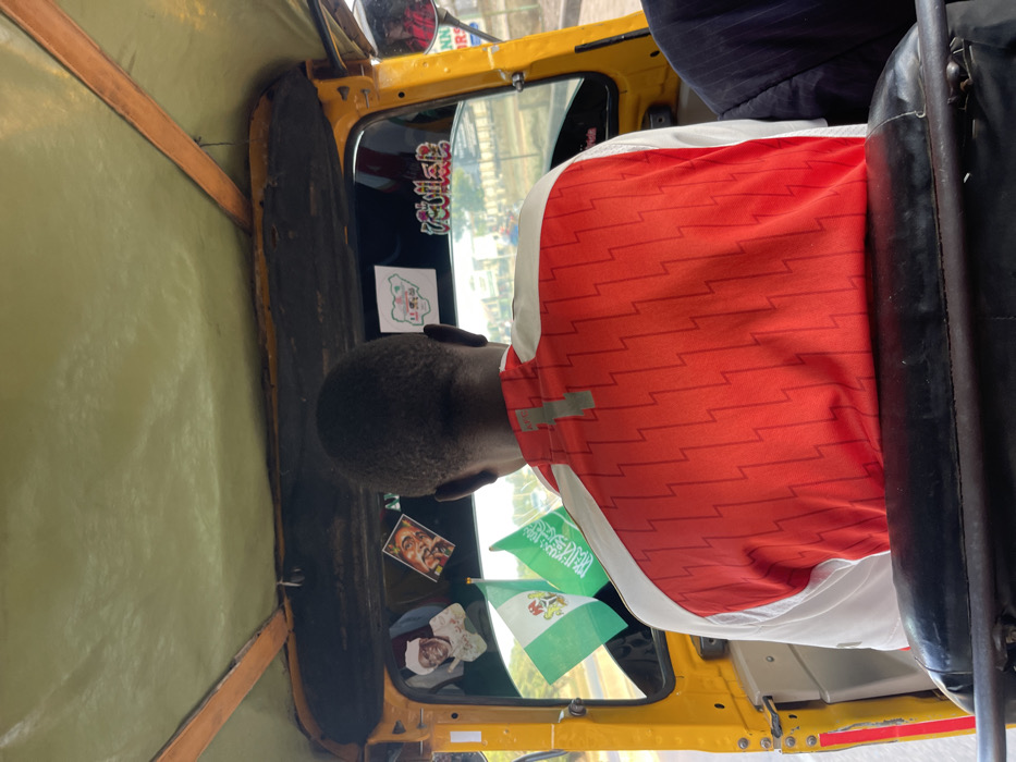 An interior view of a yellow three-wheeled auto-rickshaw in Jama A, Nigeria, shows the back of a male driver from a passenger's perspective