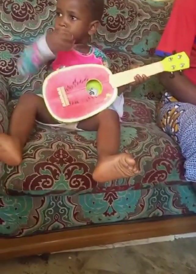 - "A young child sits on a patterned sofa strumming a watermelon-shaped toy guitar" by FM-NFvRh2, licensed under CC BY 4.0