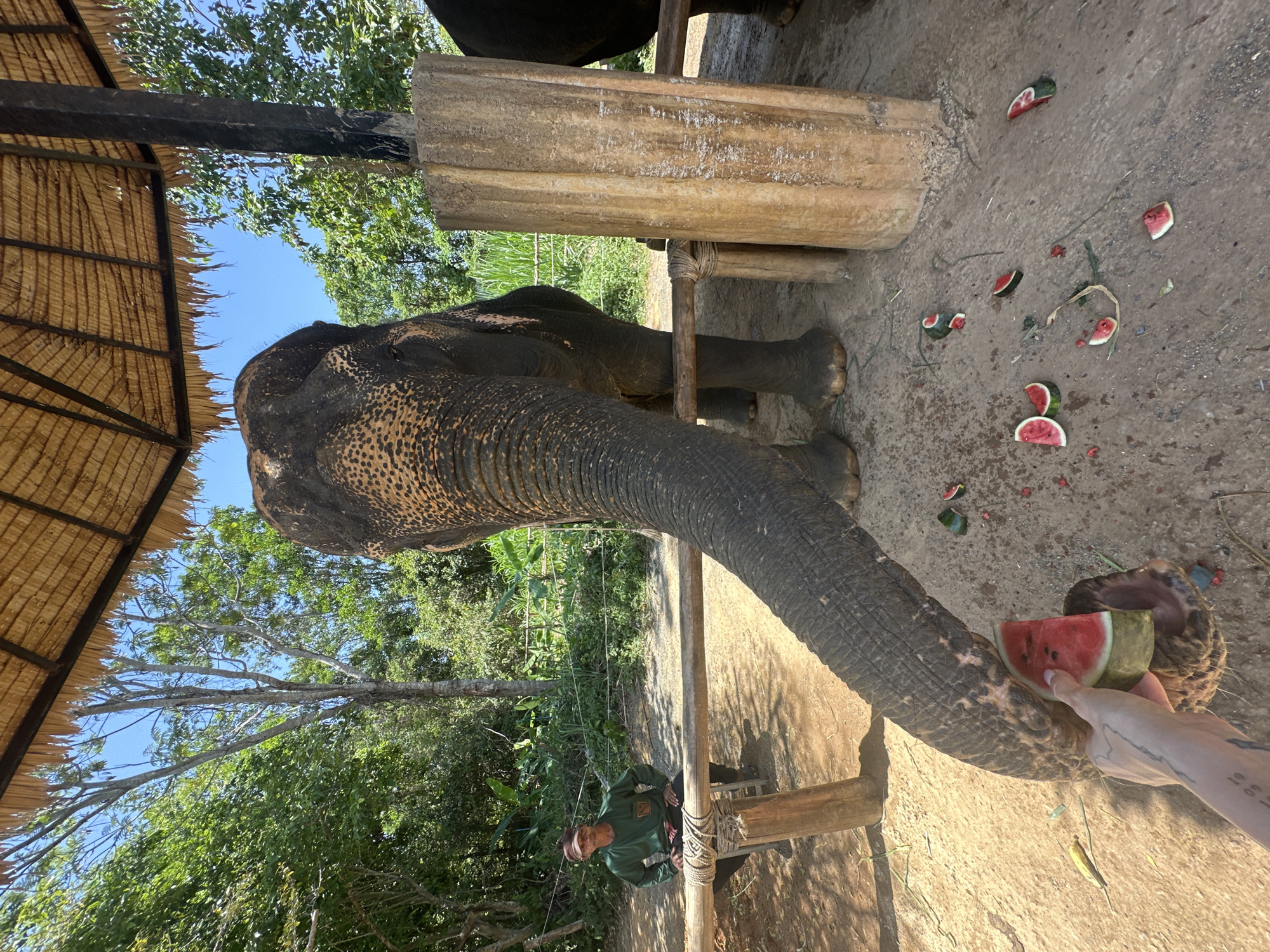 The scene depicts an outdoor interaction with an elephant in Kathu, Thailand, occurring under a thatched roof structure. A large Asian elephant, characterized by its dark, mottled skin and prominent trunk, stands centrally. Its trunk is extended towards the lower foreground, where a light-skinned human hand, exhibiting tattoos on the forearm, holds out a slice of red watermelon with a green rind. Multiple fragments of red watermelon and rind are scattered across the light brown dirt ground beneath the elephant. To the left of the frame, an adult male, wearing a long-sleeved green shirt, dark trousers, and a brown baseball cap, is seated on a rudimentary wooden stool behind a low wooden barrier. The background features lush green tropical foliage and trees beneath a clear blue sky, indicating bright daylight conditions. Wooden support posts for the thatched roof are visible on the right.