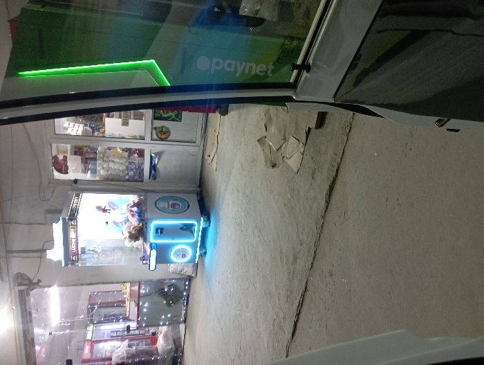 An indoor shot shows a claw machine with stuffed animals in front of a convenience store's entrance. The machine is lit with blue neon. A "Paynet" sign is visible. The floor is grey and appears to be concrete. White framing is visible in the shot, hinting at being taken from within a vehicle. Another shop with decorative lights is visible in the background, next to the claw machine.