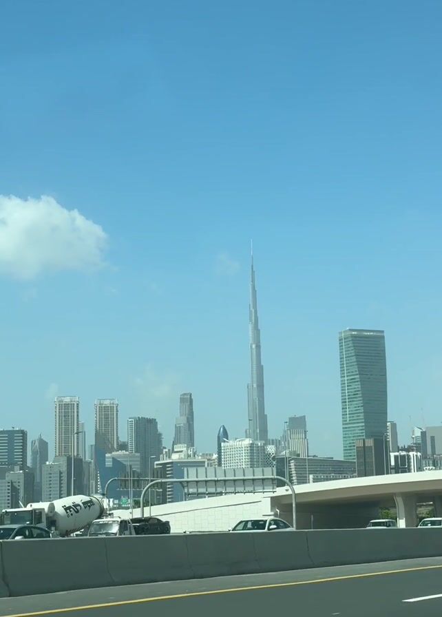 view of the Dubai skyline from a moving vehicle