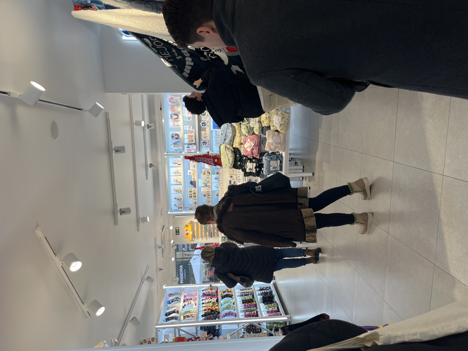 The image depicts the interior of a brightly lit retail store, identified by a visible "RIBERA" sign as being located on Calle Ribera in Valencia, Spain. The store features white walls, a white ceiling with multiple track lighting fixtures, and light-colored tiled flooring. From the foreground to the background, on the right, the upper back and head of an adult male in a dark coat are partially visible, facing away from the camera. Immediately to his left, an adult individual with dark, curly hair, wearing a black top and light trousers, is observed examining merchandise on a central display table. This individual is holding a dark blanket or throw with white text, partially legible as "MEJOR que" (better than). The central display table holds numerous neatly folded blankets or throws in pastel colors, including light blue, pink, and yellow, alongside black items, many featuring patterns such as smiley faces or animal motifs. Behind this table, a glass-fronted shelving unit displays a variety of smaller novelty items and gifts. A red conical object is also present on this shelf. Further into the store, to the left of the central display, two adult females are walking away from the viewer. The woman closer to the foreground wears a brown jacket with light-colored trim, dark trousers, and light-colored boots, carrying a black shoulder bag. Ahead of her, a second woman wears a dark puffer-style coat, blue jeans, and brown ankle boots, carrying a dark handbag. Along the left side of the store, a tall, white shelving unit displays numerous pairs of socks or similar small textile items, arranged vertically on hooks. Through a glass door or window in the far background, a blurred street scene is visible, including parts of other buildings and an awning. The overall scene suggests a busy, contemporary gift or novelty shop environment.