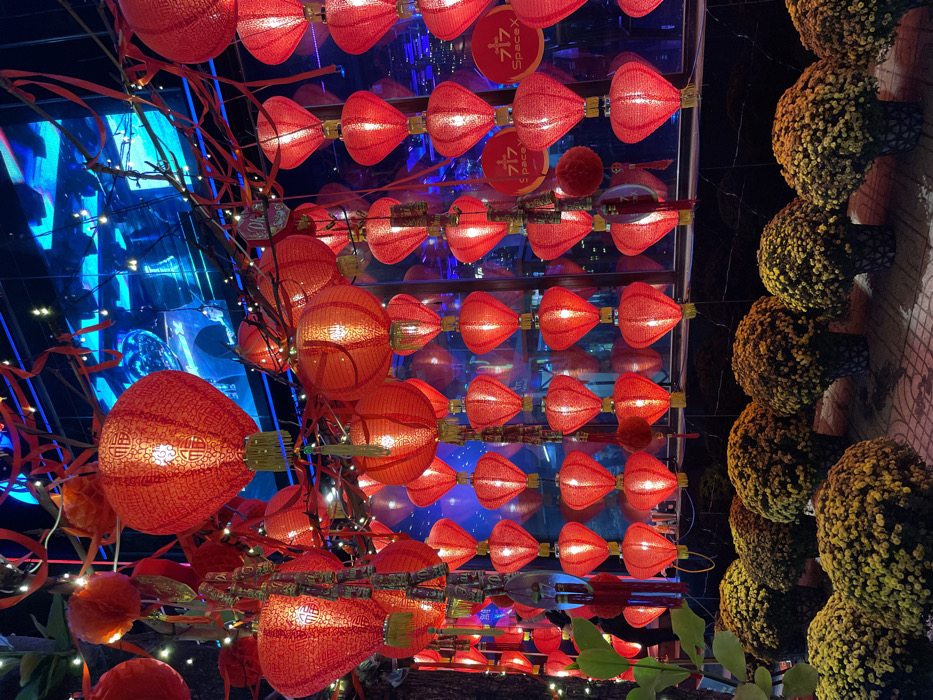 The image depicts an illuminated outdoor area in Nha Trang, Vietnam, likely the entrance or exterior of a commercial establishment, decorated for a festive occasion. The foreground features approximately 15-20 potted plants arranged in rows, each containing a dense cluster of small, yellow chrysanthemum-like flowers. These pots sit on a light-colored, patterned ground surface. The midground and background are dominated by a dense arrangement of numerous red lanterns of varying shapes and sizes, suspended from an overhead structure and tree branches. Larger, rounder lanterns with gold tassels and visible Chinese characters (likely "福" for good fortune) are positioned higher, while countless smaller, elongated, or heart-shaped red lanterns are strung vertically in columns, illuminated from within. Red ribbons and string lights are interwoven throughout the lantern display. Some lanterns have additional small decorative elements resembling miniature firecrackers or scrolls attached. Behind the lantern display, a large glass facade reflects the lanterns and the surrounding environment, while also revealing the interior of a building. The interior is characterized by vibrant blue and purple ambient lighting. Distinct reflections on the glass facade on the right side include two circular red signs, one clearly displaying the "SpaceX" logo and text. No discernible individuals are present in the immediate foreground or midground, though faint, indistinct reflections of figures are visible within the glass. The scene is static, presenting a brightly lit, decorated urban environment during what appears to be evening or night.