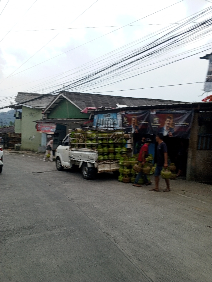 The image captures an outdoor scene on an overcast day in Kheda, India. A white compact pickup truck is parked on the right side of a grey asphalt road, its bed loaded with numerous green gas cylinders. Multiple stacks of identical green gas cylinders are positioned on the ground beside the truck. Four individuals are visible: 1. A woman in light-colored clothing and a headscarf walks towards the left, away from the truck. 2. A man in a red shirt and dark pants carries one green gas cylinder in his right hand, walking towards the right, past the truck. 3. A man in a dark shirt and dark shorts carries one green gas cylinder in his left hand, walking towards the right in the foreground. 4. A fourth person is partially obscured near the front of the truck's bed. In the background, two buildings with dark, corrugated roofs are present. The building on the left is light green. The building on the right features multiple commercial banners, including a blue one with text such as "FONDUE," and two dark banners depicting men. A dense network of overhead utility wires crisscrosses the sky above the buildings. Distant hills are faintly visible on the left horizon. The asphalt road shows minor wear and seam lines.