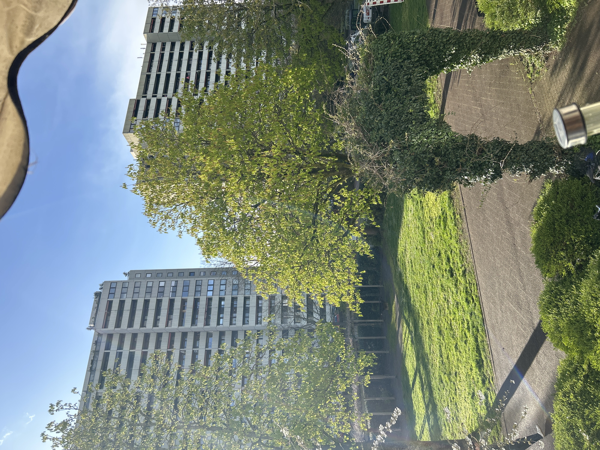 - "A high-angle, tilted view captures a scene in Karlsruhe, Germany, dominated by two tall, modern apartment buildings with repetitive window patterns against a clear blue sky" by FM-rJ3Ld2, licensed under CC BY 4.0