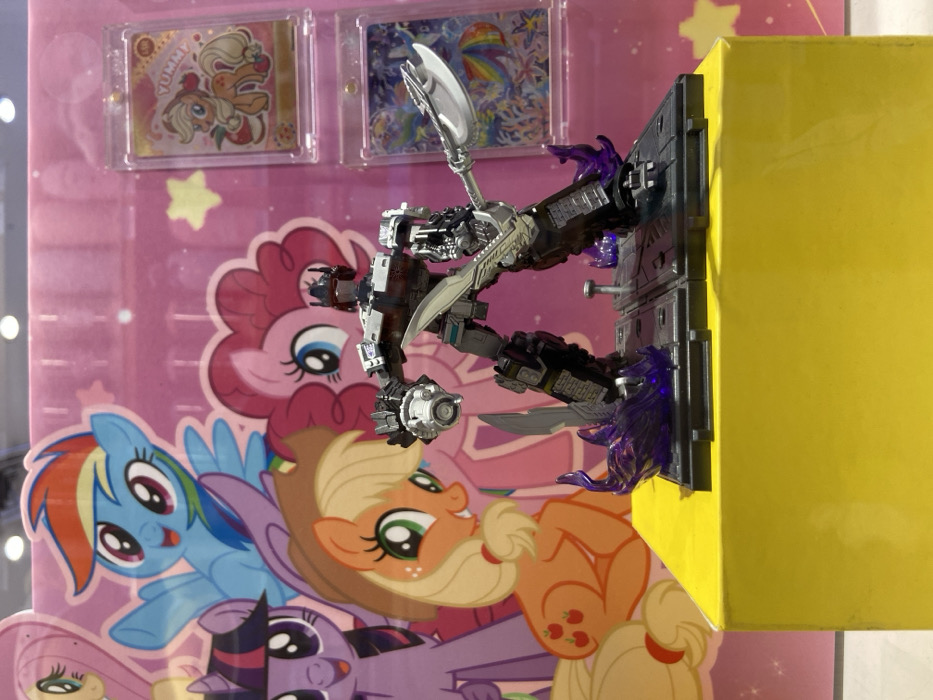 The scene depicts a display in Sidoarjo, Indonesia, showcasing a robotic action figure. A dark grey and black robot, resembling Nemesis Prime with red eyes and silver details, stands in a dynamic pose on a dark modular base. The figure holds a double-bladed axe in its right hand and a single-bladed sword in its left. Translucent purple flame-like effect pieces are attached to the base around the robot's feet. This assembly rests on a prominent yellow rectangular display block. The background consists of a pink panel or wall illustrated with large My Little Pony characters, including Twilight Sparkle, Rainbow Dash, Applejack, and Pinkie Pie, accompanied by yellow star motifs. Two trading cards, encased in clear protective holders, are affixed to the background on the right side; the upper card features Applejack with a strawberry and "YUMMY" text, while the lower card exhibits a colorful abstract design. Reflections from overhead lighting are visible across the top of the display.