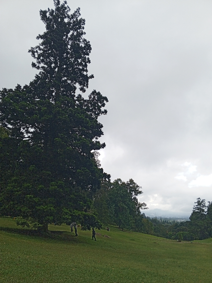 The image portrays an outdoor landscape in Khe Sanh Commune, Vietnam, under an overcast sky. A large, dark green coniferous tree, dense with foliage, dominates the left side of the frame, extending from the lower left to near the top. The foreground and midground are covered by a lush green grassy slope, ascending slightly from left to right. In the midground, beneath the shadow of the large tree, two human figures are visible: one in light-colored clothing partially obscured, and another in darker attire standing upright. A third, smaller figure is further to the right on the grassy incline. A dense line of diverse green trees forms a natural boundary across the midground and recedes into the background. In the far distance, a hazy urban or semi-urban area with indistinct structures is visible, nestled amidst hills and vegetation. The sky is uniformly covered with light grey clouds.