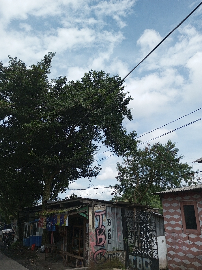 A ramshackle shop sits under a large tree, its metal walls covered in graffiti. Assorted items hang from the roof, and a small table with benches suggests a place to pause. Beside it, a narrow metal gate provides a glimpse into a shaded area. A building with a red and white geometric pattern on its walls stands to the right, featuring a single window. Overhead, power lines stretch across a sky dotted with scattered clouds.