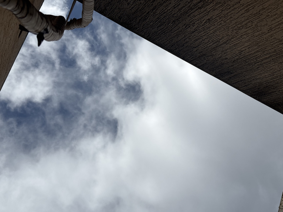 The image displays an upward perspective of a partly cloudy sky framed by architectural elements, situated within the urban environment of Fez, Morocco. The sky, occupying the central and upper portions of the frame, exhibits scattered white and grey cloud formations against a background of deep blue sky. A steeply angled, textured building wall, dark brown or grey in color and appearing to be stucco, traverses diagonally from the bottom right corner towards the upper center. Originating from the top right corner and extending downwards, an off-white, spirally wrapped conduit or pipe is visible, secured by a dark, projecting fixture. A minor, lighter-toned architectural surface is partially discernible in the extreme top left corner. No individuals, animals, or specific actions are present within the scene.