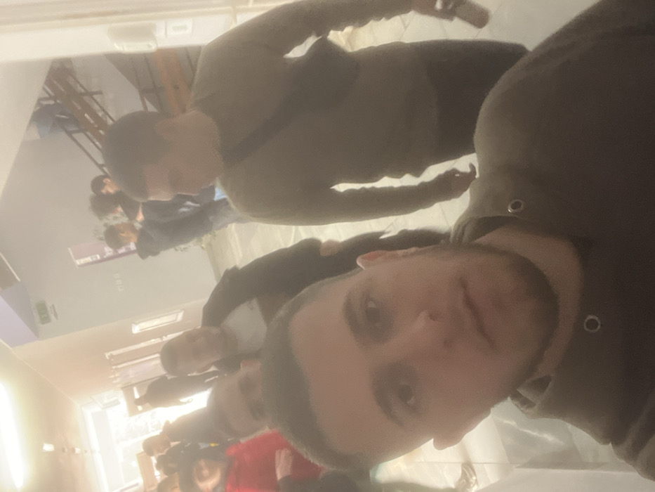 The image depicts an indoor common area or hallway within a building in Pravets, Bulgaria. In the immediate foreground, a young male subject with short dark hair and a beard, wearing a dark brown hooded sweatshirt with visible metal eyelets on the drawstring, is positioned, looking directly at the camera. Approximately eight to ten additional individuals, predominantly young males, are visible throughout the midground and background, standing or walking. To the right of the foreground subject, a male in a dark olive-green long-sleeved shirt and a black cross-body bag is visible, holding a mobile phone in his right hand. Behind the foreground subject, another male wears a dark jacket over a white garment. The environment features light-colored walls and a reflective, light-colored floor. A dark-railed staircase ascends in the upper right background. A bright light source at the far end of the hallway generates significant glare and lens flare in the upper left quadrant of the image. Framed items are mounted on the walls, and a faint green sign is discernible on the left wall. A plant is visible near the staircase in the background. The scene conveys a populated, active indoor space.