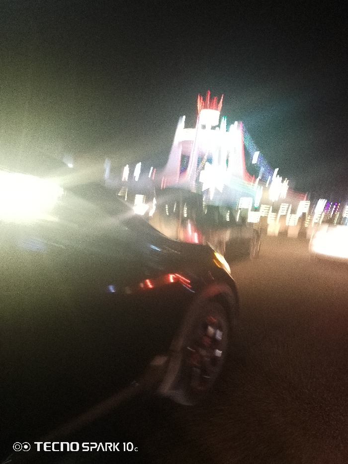 A blurry, low-light image features a dark car in the foreground, capturing its front tire and side panel reflecting red lights. The background displays a brightly illuminated, complex structure resembling a castle or amusement park ride. Its white framework is outlined with colorful lights, creating a fairyland aesthetic. Further back, other vehicles and light sources are diffused, contributing to the overall motion blur and nighttime atmosphere. The bottom left corner shows the text "TECNO SPARK 10c."