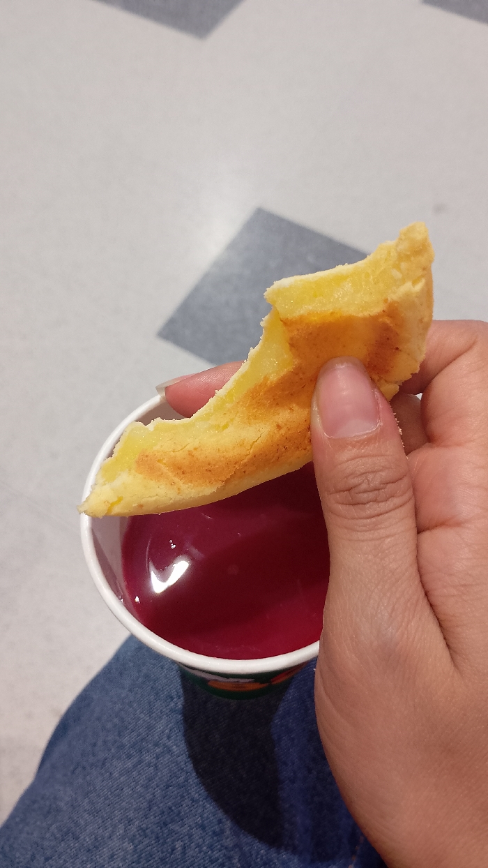 - "A hand holds a crescent-shaped piece of golden-brown cake, likely a cornbread wedge, over a white paper cup filled with a dark red liquid, possibly juice or cranberry sauce" by FM-aKaU63, licensed under CC BY 4.0