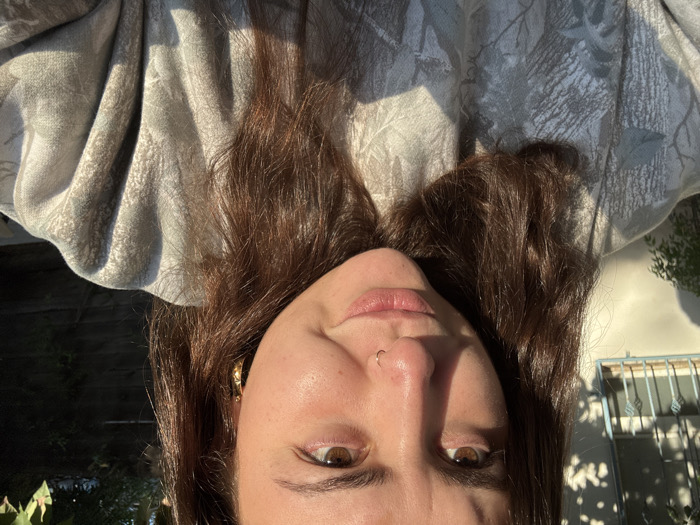 A woman with light brown hair and fair skin looks directly at the camera, which is positioned above her. She has brown eyes, a nose piercing, and is wearing a patterned gray top. Behind her, sunlight casts shadows on a white wall and a window with bars. Some green foliage is visible on the left side of the frame. The image is rotated counter-clockwise.