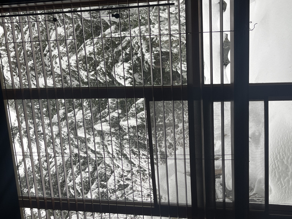 A window covered with blinds looks out on a winter scene. The snow-covered landscape outside is partially obscured by the closed blinds. Some windows are completely blocked by snow, and the scene outside is a dense blanket of white on trees. The window frame is dark, providing a strong contrast to the bright snowy scene beyond.