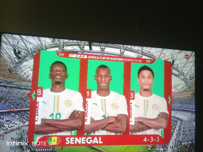 A digital photograph, captured by an Infinix NOTE 8 device, depicts a large screen displaying football-related graphics. The screen showcases three dark-skinned male football players, presented as headshots within red-bordered green rectangular panels, with their arms crossed. From left to right, they are identified by names and numbers as I. SARR (number 8), N. JACKSON (number 1), and I. NDIAYE (number 3), all wearing white jerseys with green, yellow, and red vertical stripes, and the Senegal national team crest. The player in the left and middle panels also has the number "10" on his jersey. A banner at the top of the screen reads "CAF AFRICA CUP OF NATIONS MOROCCO 25" with a "LIVE" indicator, while a banner at the bottom displays "SENEGAL" accompanied by the Senegalese flag, and the formation "4-3-3". The background behind these graphics is an image of a large, empty, modern football stadium featuring multi-tiered white seating and a complex roof structure. The image captures the screen in a dimly lit indoor environment, serving as the primary light source, located in Unknown, Unknown.