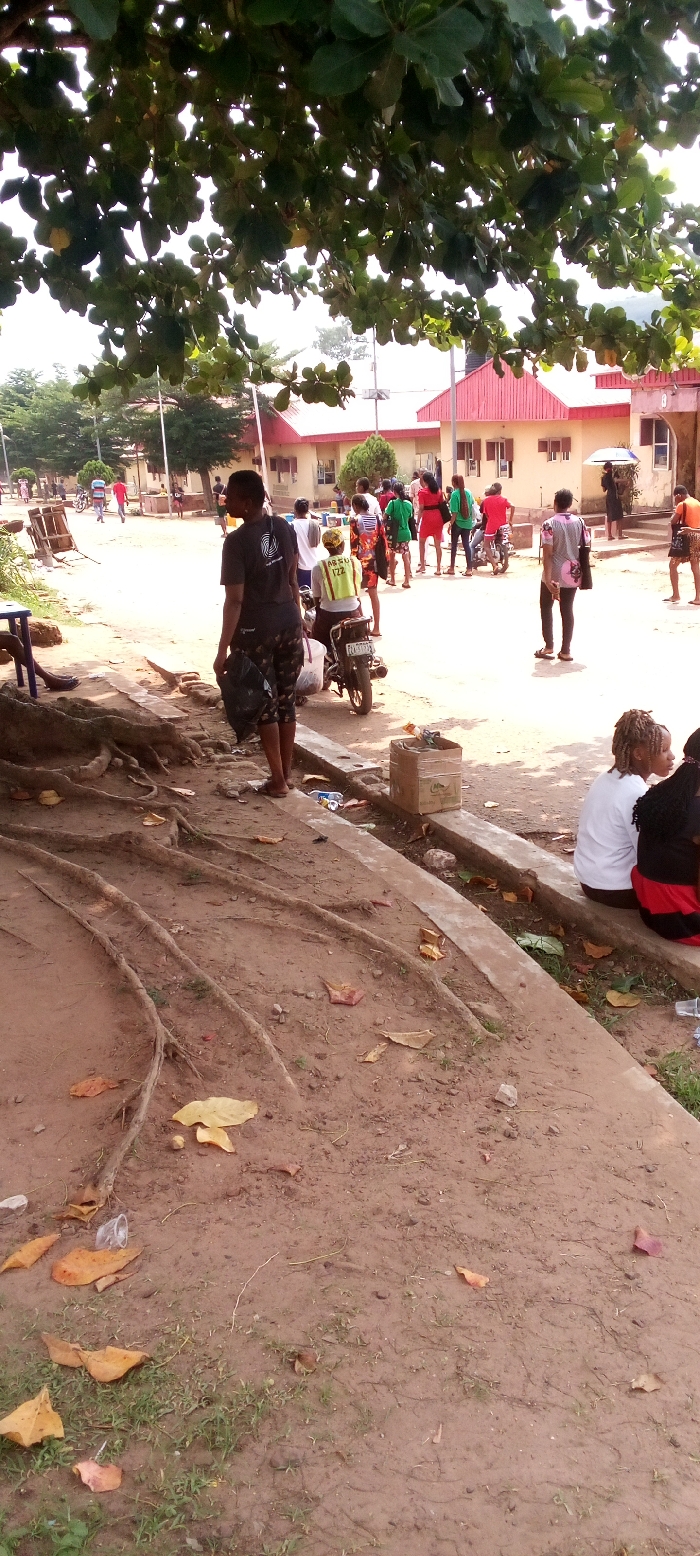 scene in Okigwe, Nigeria (latitude: 5.82, longitude: 7.394) featuring a group of people, a motorcycle, and a building. The people are walking on a dirt path with trees in the background. There are several trees in the scene, with visible roots, and fallen leaves on the ground. The image is taken from a low angle, looking up at the people and buildings. There is a small building with a red roof in the background, and a motorcycle parked on the path. The people are dressed in casual clothing. Two women are standing near the motorcycle, one wearing a yellow safety vest and the other wearing a black t-shirt. There are several other people walking in the distance.