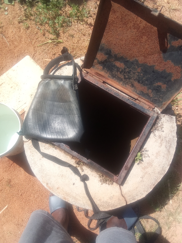 The scene depicts an outdoor setting in Barakin Akawo, Nigeria, characterized by reddish-brown earth and sparse green vegetation under bright daylight. A circular concrete structure, approximately one meter in diameter, serves as a wellhead or access point. Its square, heavily rusted metal lid is open and propped back, revealing a dark, square opening below. A dark, possibly recycled tire material bag with a strap is positioned on the concrete edge, partially extending over the dark opening. To the left of the concrete structure, a white plastic bucket containing a light green liquid is visible on the ground. The lower half of a person is visible in the foreground, wearing light-colored trousers and light blue/grey sandals.