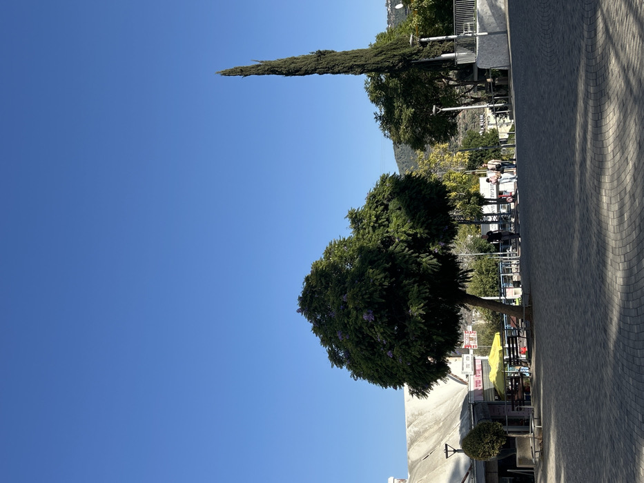 This image depicts an outdoor public square or pedestrian area in Karmiel, Israel, under a clear, bright blue sky. The ground is paved with gray interlocking pavers arranged in a circular pattern. Distinct shadows are cast, indicating bright sunlight. In the left-center, a large tree with dense green foliage and scattered purple blossoms is prominent. To its right, in the mid-ground, a tall, slender cypress tree stands. Behind the large tree on the left, a low-rise building with a light-colored roof and facade is visible, featuring storefronts. One storefront displays partial Hebrew text, including "צפתי". In front of these storefronts, a yellow outdoor umbrella shades a dark bench. Various other trees and green-covered hills are visible in the background, with some distant foliage appearing yellowish. Four individuals are present in the mid-ground, walking on the paved surface. One person, dressed in dark clothing, walks from left to right. Further right, a group of three people walks from right to left; one individual in this group carries a bag. Multiple modern streetlights with square fixtures are distributed throughout the scene. On the far right, a white concrete wall topped with a metal railing borders an elevated section.