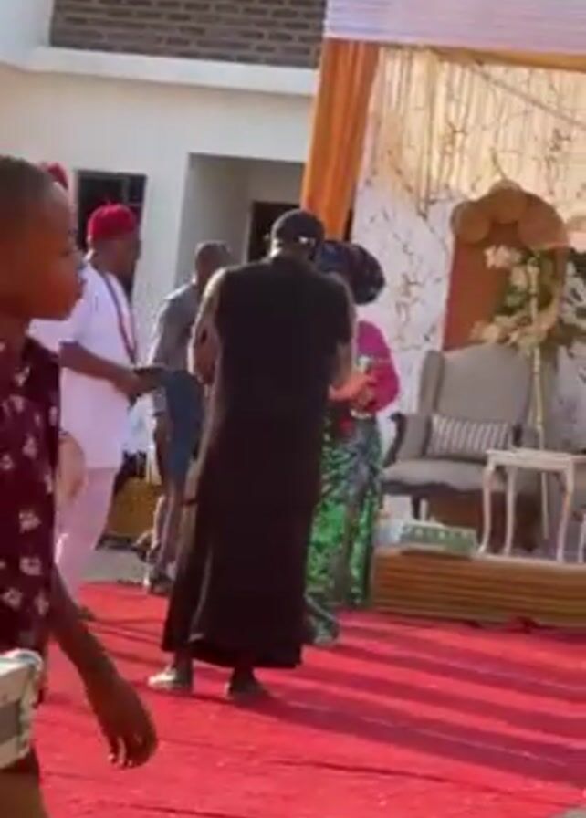 what appears to be an outdoor event, possibly a wedding or a formal gathering. Several people are dressed in traditional Igbo attire, including white outfits and red caps. Some are holding fans, and one person appears to be playing an instrument. A red carpet is laid out, and there is a decorated area with tents or canopies. People are walking around, and there's a sign that reads "Nwaowa United Brothers." The setting seems to be a sunny day, and the atmosphere suggests a celebration.
