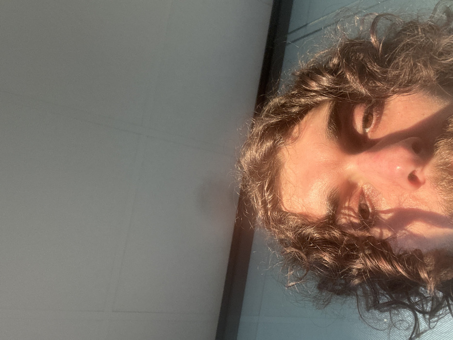 An extreme close-up, upward-angle indoor photograph captures the lower half of an adult male's face, positioned against a plain light-colored ceiling. The subject has dark brown, densely curly hair that frames his face and extends across the visible forehead. His brown eyes are open and directed towards the viewer. A light-colored mustache and beard are visible around his nose and mouth area. Strong, warm directional lighting originates from the subject's right side, brightly illuminating that half of his face and casting distinct shadows on his left side, notably under the nose and around the left eye. The upper two-thirds of the image display a light grey or off-white ceiling, which appears to be a tiled or paneled surface with faint grid lines. A narrow, dark horizontal bar, possibly a window frame or architectural element, is visible directly above the subject's hair, bordering a faint bluish-green area that suggests an exterior view through a window. The scene is situated indoors in the city of Vincennes, France; no specific external landmarks or identifying architectural features are present in the image to visually confirm this location. No actions or interactions beyond the subject's direct gaze are depicted.